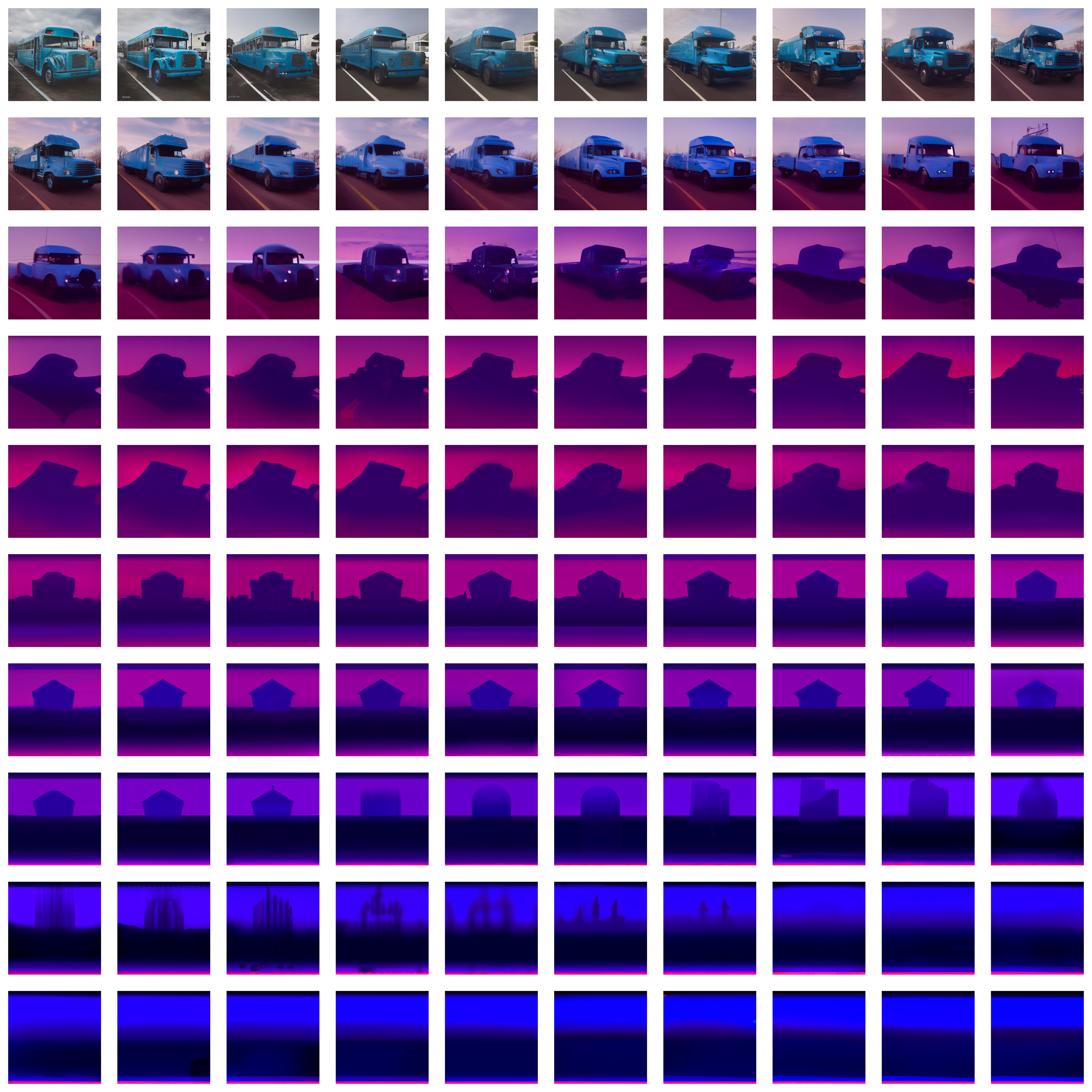 prompt: A blue school bus parked in a parking lot. A hundred iterations of feedback loop.