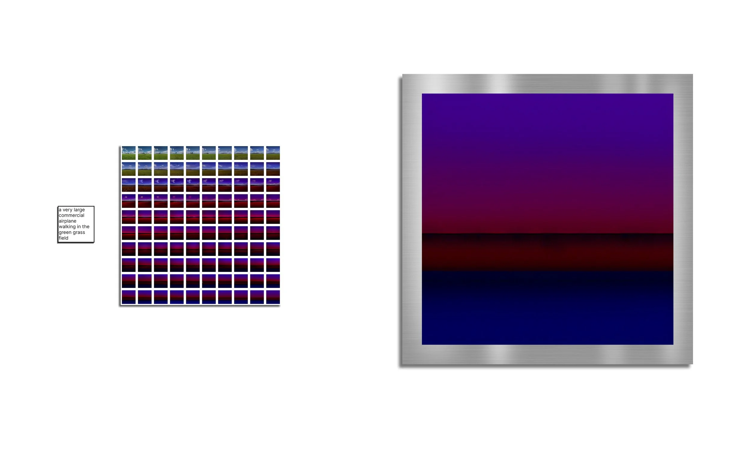 Installation proposal. The prompt is framed in a simple frame, and the grid (100 cm x 100 cm) with the 100 iterations of the feedback loop. One of the outputs -probaply the last one is printed (or painted ) on aluminioum.