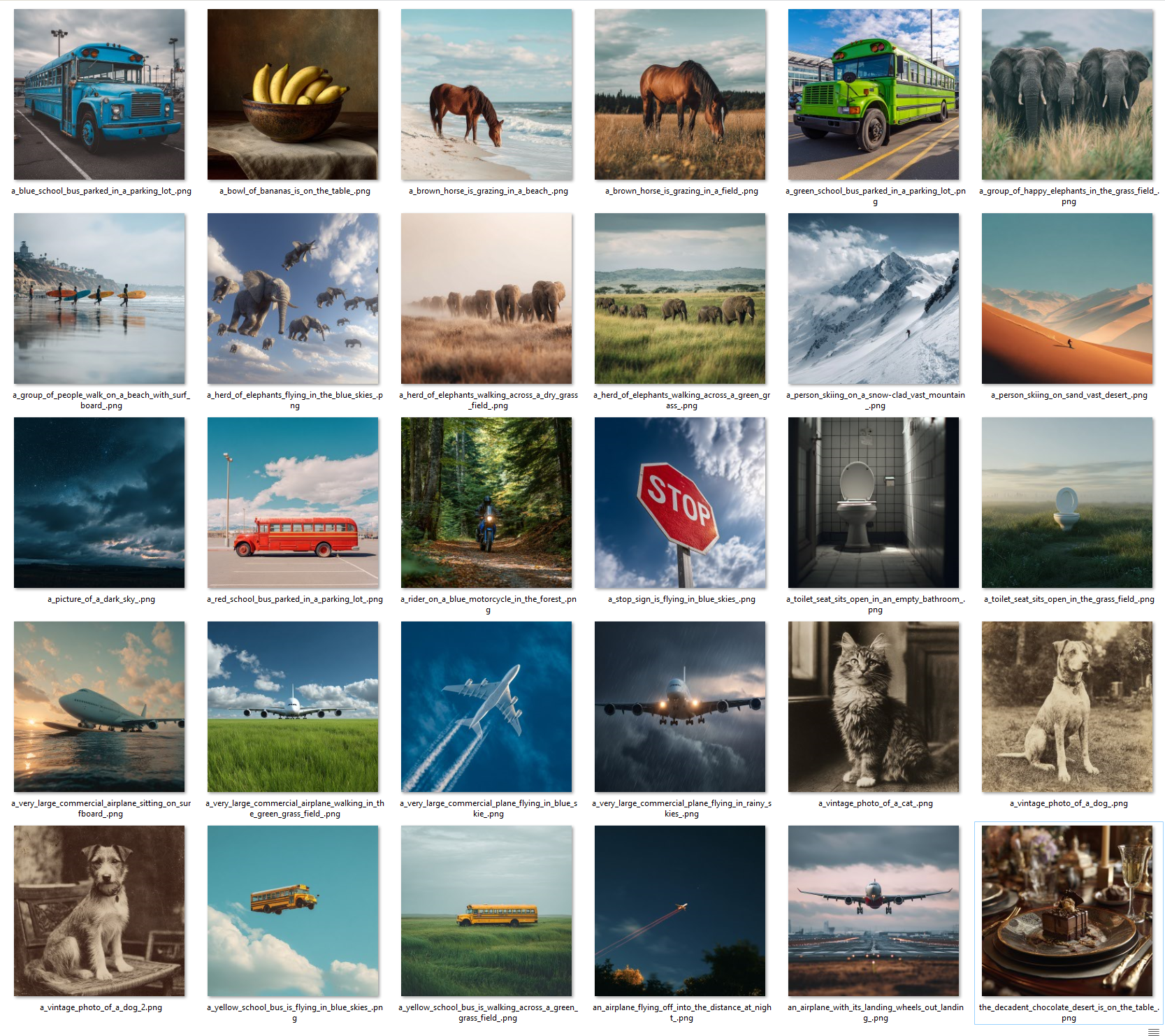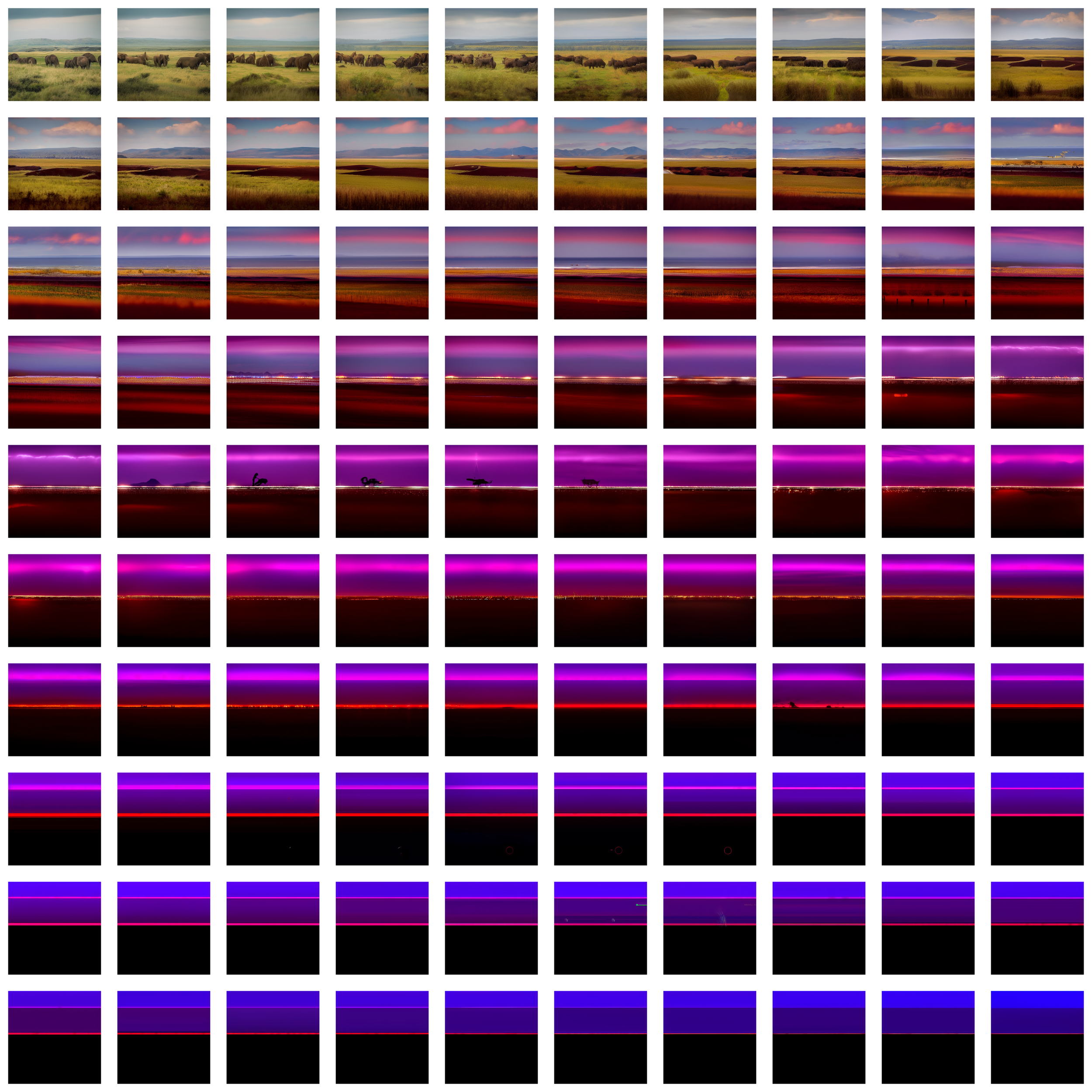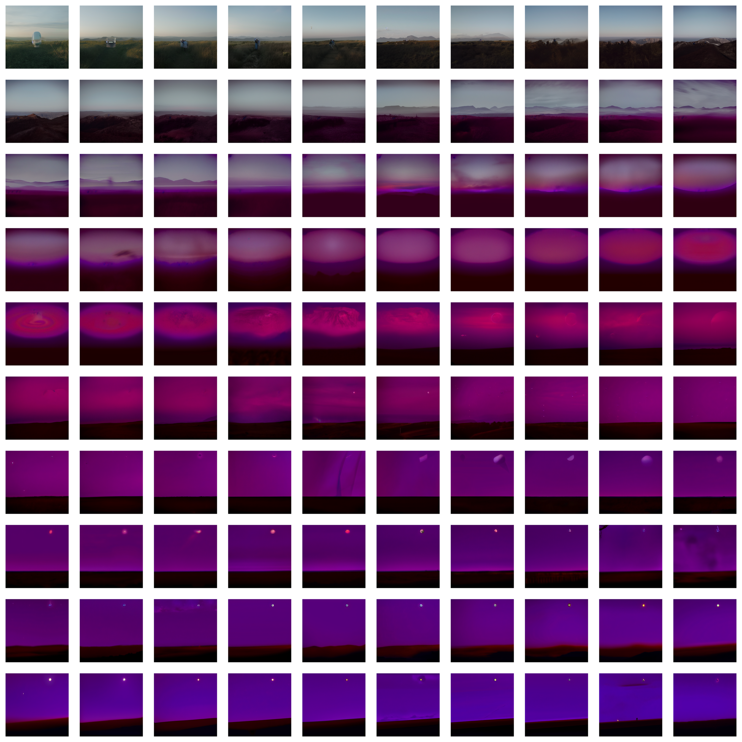 A decade later and well into the post-AI era, this work returns to Mansimov’s original prompts and processes them to a speculative point of ending. Beginning with photorealistic interpretations of his prompts generated in Midjourney, each image was passed through an image-to-image AI (Stable Diffusion), the output fed back as the next input, again and again—one hundred iterations in total.