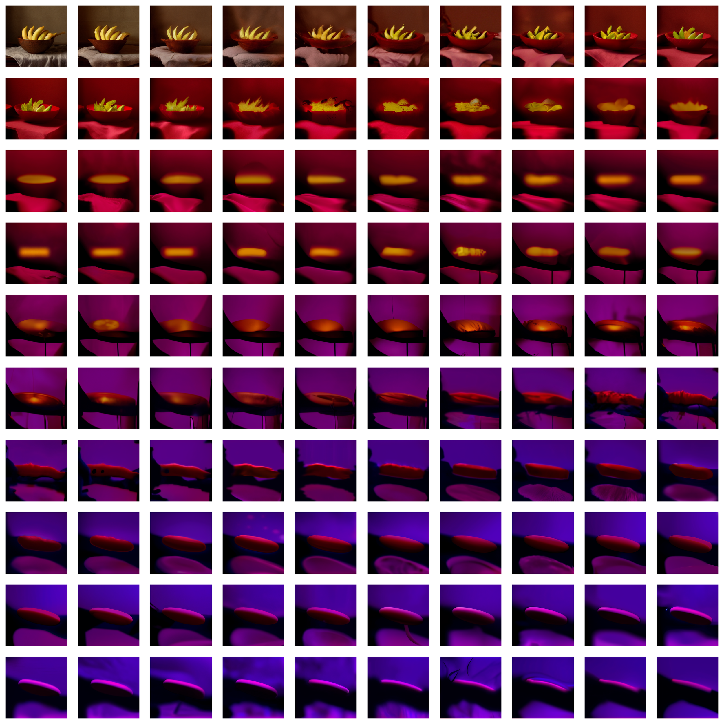 prompt: a bowl of bannanas is on the table. A hundred iterations of feedback loop.