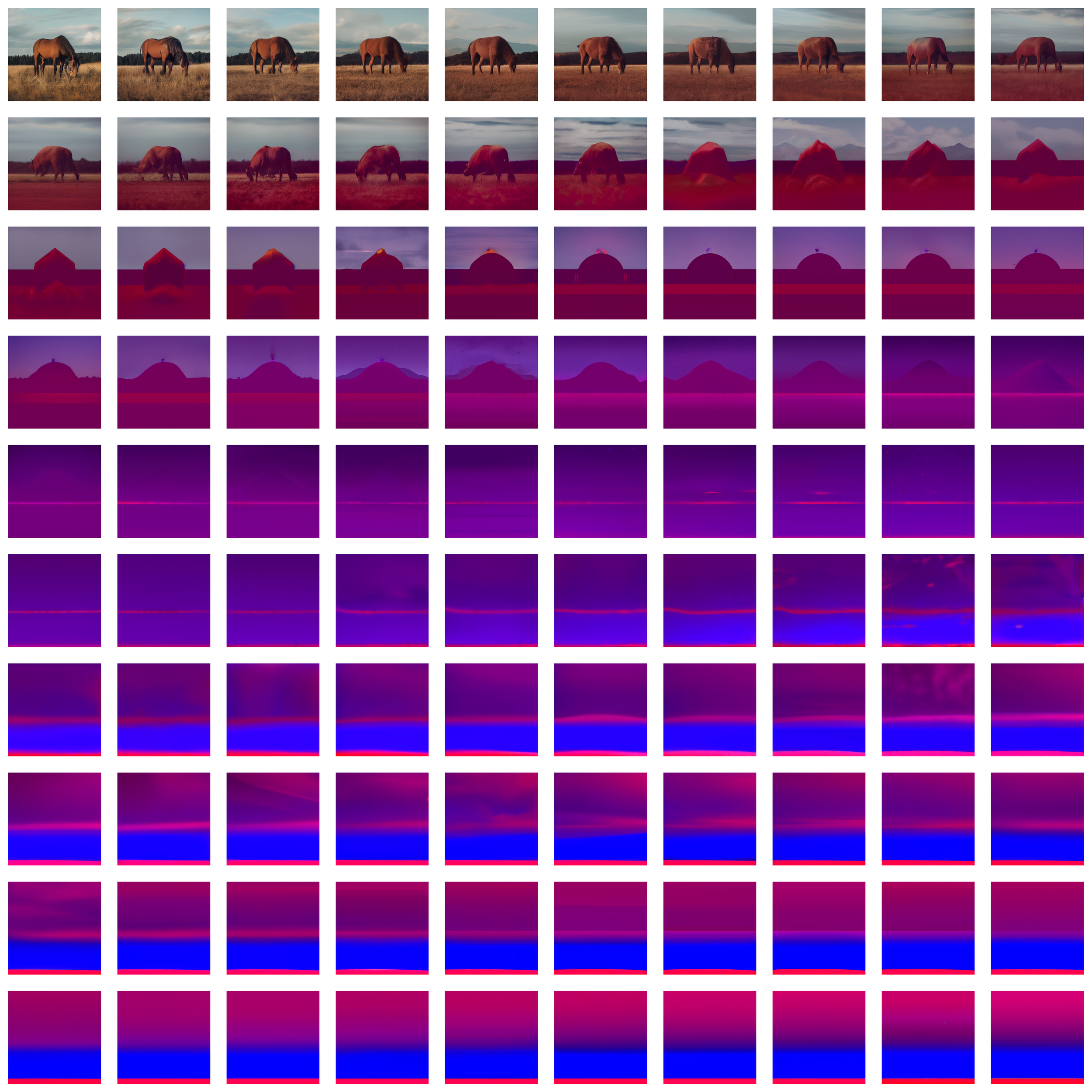 prompt: a brown horse is grazing in a field. A hundred iterations of feedback loop.